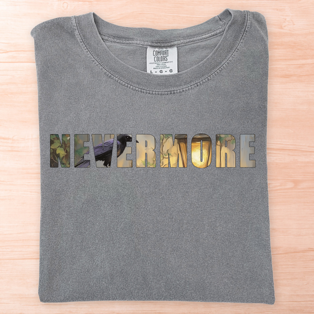 Design features the word "Nevermore" overlaid with a raven and lantern.