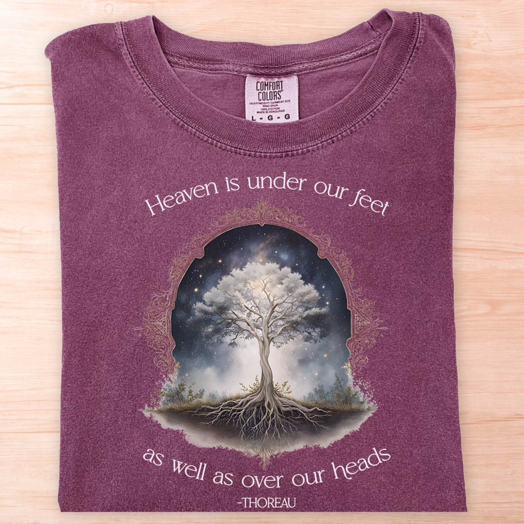 A contemplative design featuring Henry David Thoreau's profound quote: "Heaven is under our feet as well as over our heads." A luminous tree of life stands within an ornate archway, its branches reaching toward a starlit sky while its roots mirror below, symbolizing the connection between earth and cosmos. Perfect for nature lovers, philosophers, transcendentalist enthusiasts, and anyone who finds the sacred in the natural world. A beautiful reminder to appreciate the ground beneath us as much as the sky above.